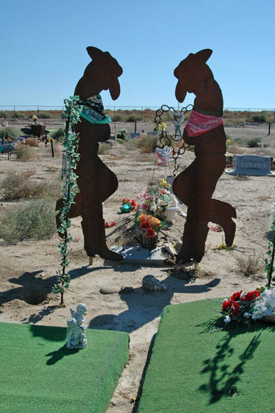 But my favorite exhibit is the local graveyard, named Elgin Cemetery after a long gone pioneer settlement. There is no grass, and evidently no rules dictating what sort of monument is allowed. The result an eccentric gallery of artifacts that celebrate the lives, occupations and passions of departed souls–everything from ore carts, drilling rigs, whirligigs, boots and saddles–even a one-hole astroturfed putting green. None are signed; all are deeply touching, in particular because it’s far removed from the highway, scenically situated in the middle of a high desert, bordered by the Book Cliffs to the north and the “Silent City” of the San Rafael Swell to the south.